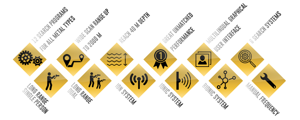 Le logiciel de l’appareil possède une interface utilisateur graphique attrayante avec des symboles et des commandes faciles à comprendre et à ajuster même pour les débutants dans le domaine de la détection de métaux, afin que l’utilisateur puisse facilement choisir différents paramètres tels que le système de recherche, la distance, la profondeur, le type de sol et d’autres paramètres .