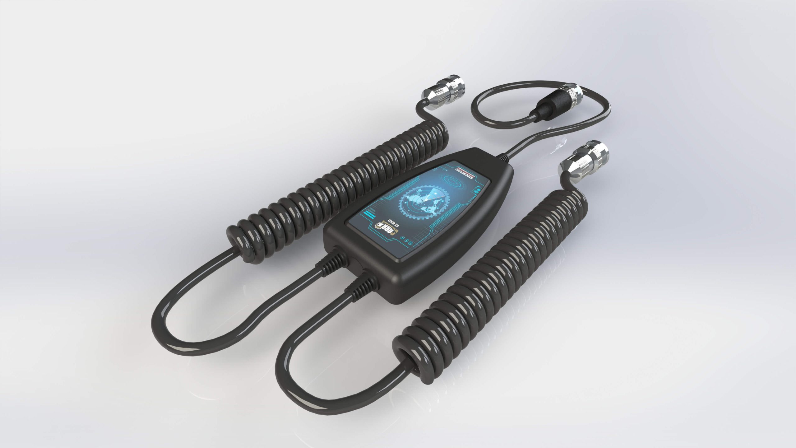 Chaque poignée à la fin a un port ou une prise qui se connecte à une unité de liaison via des câbles en spirale et cette unité se connecte à la fin avec un câble court avec une unité à longue portée qui contient un petit écran pour afficher différentes informations (programme de recherche, sol, profondeur et distance comme cela sera expliqué plus loin) où cette unité continue de recevoir des données de l’unité du générateur de fréquence au sol (planté dans le sol au début des travaux), qui est connecté à l’unité principale de l’appareil via un câble contenant deux pièces à la fin, le noir et le rouge se connectent aux fiches correspondantes à l’avant de l’unité principale.