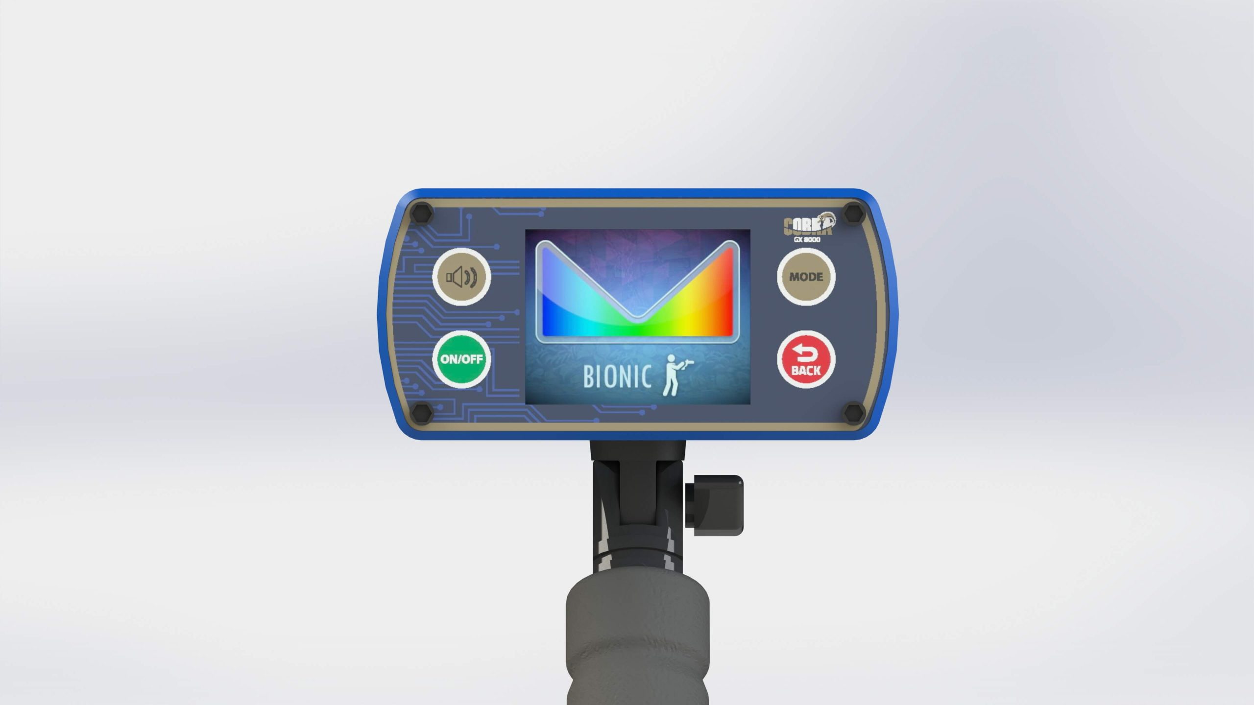 L’unité des systèmes ioniques dispose d’un petit écran affichant une représentation visuelle des signaux en fonction du système utilisé et il y a un port à l’avant où le capteur correspondant au système de recherche sélectionné est installé.